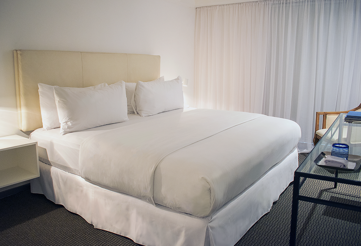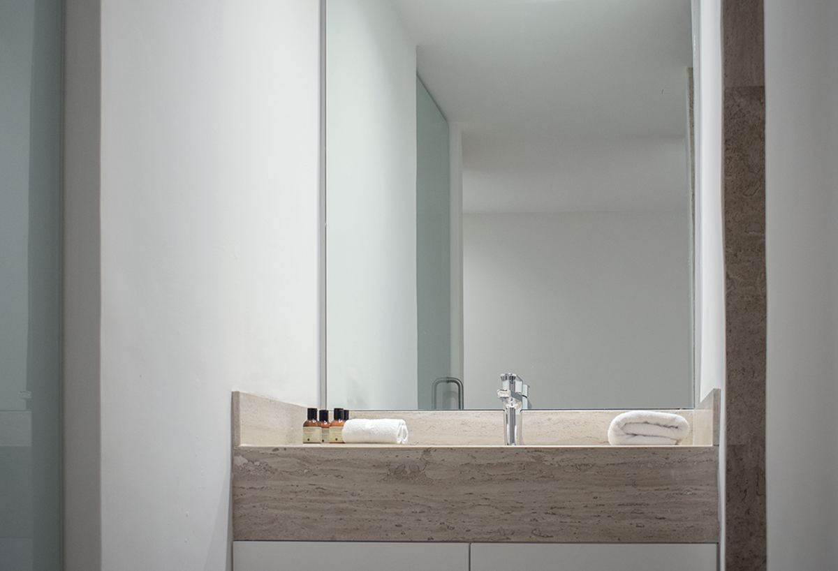 Cama extragrande o dos matrimoniales fabricadas con materiales hipoalergénicos y antibacteriales de alta calidad. Sábanas de algodón de 300 hilos. Baño recubierto en suelo y paredes de mármol travertino con compartimentos separados entre regadera, lavabo e inodoro, ducha de lluvia y regadera de mano, grifería de acero inoxidable y amenidades ecológicas.