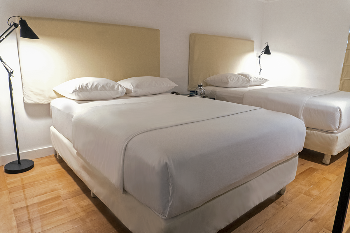 Suelos de madera natural haya o vinil trenzado en la zona del dormitorio. Cama extragrande o dos matrimoniales fabricadas con materiales hipoalergénicos y antibacteriales de alta calidad, cabecera, rodapié y cortinas confeccionadas en terciopelo de algodón y/o loneta del mismo material. Baño recubierto en suelo y paredes de mármol travertino, lavabo vintage de porcelana en un espacio unificado o compartimentos separados entre regadera, lavabo e inodoro, ducha de lluvia y de manos, grifería de acero inoxidable y amenidades ecológicas.