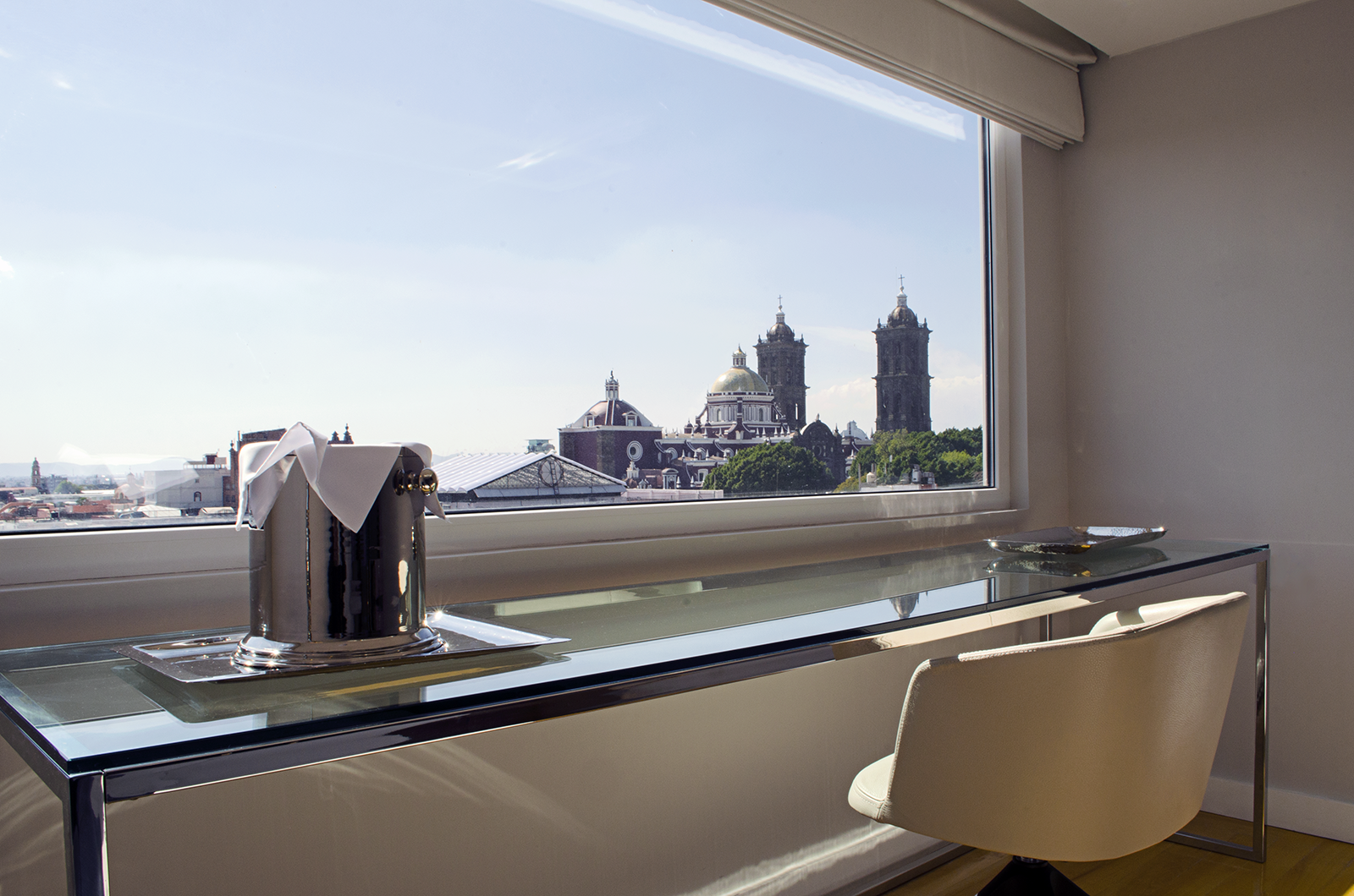 Una vista inolvidable de la Catedral, la Compañía, el volcán Popocatepetl y numerosas iglesias barrocas.