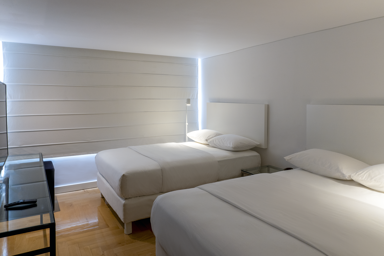 La habitación doble cuenta con dos camas matrimoniales fabricadas con materiales hipoalergénicos y antibacteriales de alta calidad, sábanas de algodón de 300 hilos, cortinas de loneta. Esta área se puede modificar para oficina o zona de trabajo o vestidor para largas estancias.